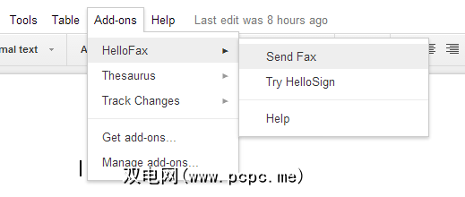 请先下载该附件,然后再下载从要发送的Google文档顶部的“附加组件"菜单中选择它,然后单击“发送传真"。