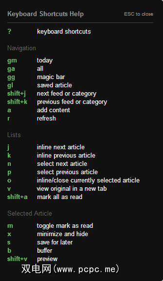 Feedly提供的键盘快捷键列表并不像Gmail那样详尽(在打开的Gmail窗口中按?即可看到(我的意思是),但可以很好地完成工作。您将获得快捷方式,用于在文章和供稿之间快速跳转,将供稿标记为已读等。但是 gg 的“魔力棒"是什么?很高兴您问到:
