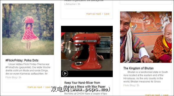 在消费新闻时,生产力就是浏览您的供稿(我们),以及有关您使用这些Feed中内容的速度有多快。我们大多数人只是想进入那里,在狂热的新闻消费者等头条新闻上哭,然后再次退出,直到我们下一次拖延(或“研究")。这意味着信息必须以易于扫描和处理的方式进行布局。说起来容易做起来难:某些供稿主要由图像(Flickr)组成,而有些则是大量文本,而有些则主要是视频(YouTube)。如果这还不够的话,那么不同的人会以不同的方式阅读。