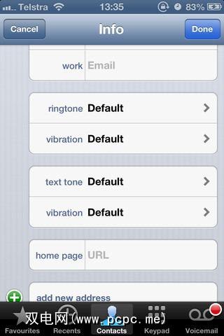 在电子邮件字段下方,是一个用于定义通话,短信音和振动的选项。点击振动字段以查看熟悉的选择,您可以从保存的自定义振动中进行选择,也可以点击创建新振动进行其他选择。