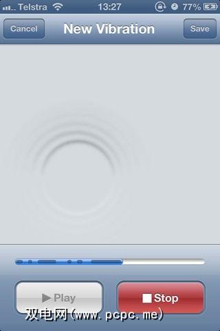 要创建自定义振动,您将在屏幕底部看到一个空白区域,其中包含 Play 和 Stop 控件。触摸点击以创建振动模式框,iOS会开始记录您的自定义振动。
