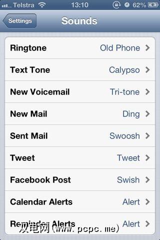 默认情况下,此菜单中很少有不会触发任何振动的选项,例如“已发送邮件",“ Tweet"和“ Facebook Post"都是传出功能。同样,如果您要在发送电子邮件时关闭“啸叫" Tweet声音或“啸叫"警报,可以使用此菜单。轻触警报,您将看到三个部分–“振动"(),用于定义物理蜂鸣声,“警告音" 和铃声。