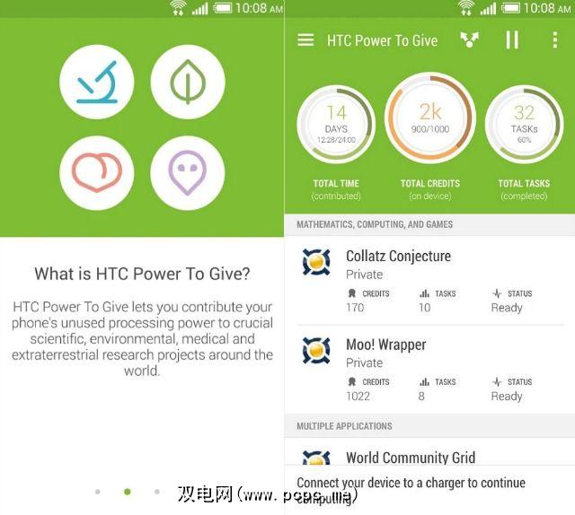 如果您的手机是HTC机型,请下载Power to Give应用,插入手机并连接Wi-Fi。您未使用的计算资源将捐赠给您选择的研究项目。通过像平常一样使用手机,可以在很短的时间内实现医疗,环境解决方案和通常需要一生才能实现的许多其他重要发现。