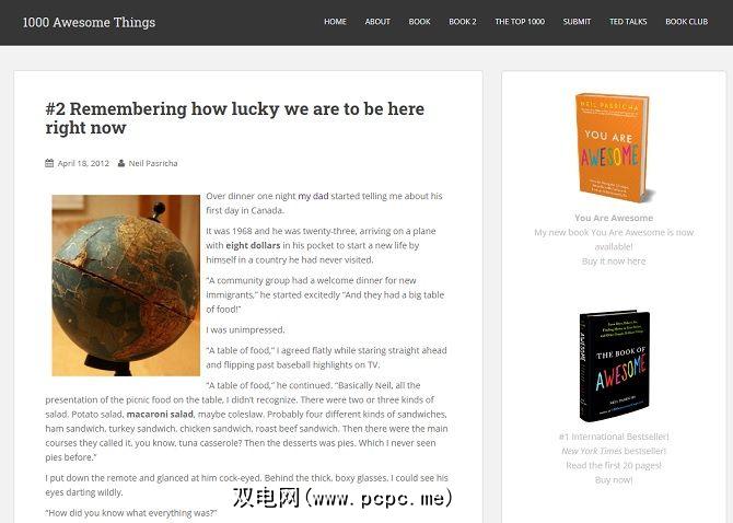 1000令人敬畏的事物源于个人悲剧。尼尔·帕斯里卡(Neil Pasricha)的婚姻破裂于2008年,一位朋友自杀身亡。他决定写一个博客来庆祝生活,特别是每个工作日中的一件很棒的事情,持续1000天。