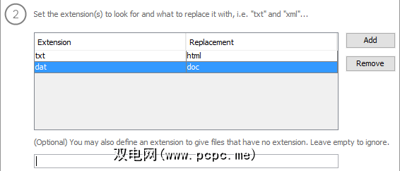 第二,添加扩展名以及替换扩展名的内容,例如DAT与DOC。如果您没有扩展名的文件,也可以通过在第2步底部的空行中添加扩展名来处理这些文件。