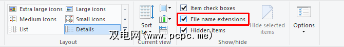 在Windows 8和10中,转到查看并在 File旁边设置复选标记扩展名。