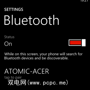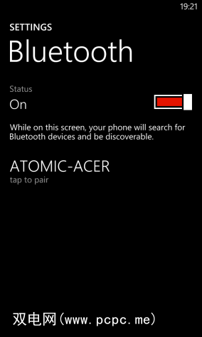 要在手机上激活蓝牙,请打开设置>蓝牙,然后切换到开启。然后,Windows Phone 8将查找任何可发现的设备。例如,如果要连接Windows PC,则打开控制面板>网络和Internet>更改蓝牙设置,以确认计算机已设置为可发现。