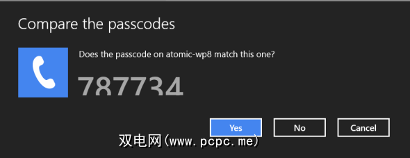 一旦您的诺基亚Lumia 920系列电话找到了计算机名称,便可以点击以开始配对过程(该过程需要您在两台设备上确认显示相同的安全号码)。