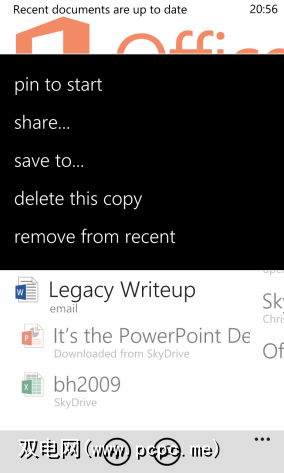Word,Excel,PowerPoint和OneNote的Microsoft Office Mobile应用程序使您可以轻松地打开,编辑和保存已发送给您的所有文档。文档将保存到您的SkyDrive帐户中,以避免在删除电子邮件时意外丢失。