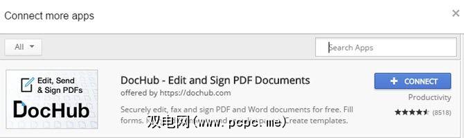 搜索DocHub。结果出现时,点击蓝色的 Connect 按钮将其安装到Google云端硬盘。