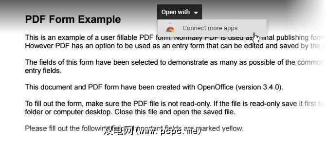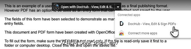在显示PDF表单的同时,点击文档顶部的打开方式选项。尚未安装DocHub,因此请点击连接更多应用链接,该链接会将您带到网上商店。