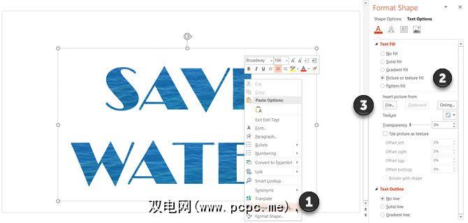 方法2:右键单击所选文本,然后单击格式化文本效果。转到“文本选项"下的第一个选项(文本填充和轮廓)。选择图片或纹理填充,然后从桌面上的文件或在线来源中选择图片。