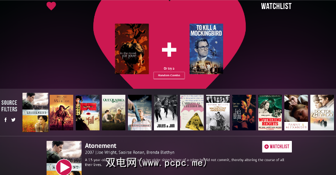 向该应用程序添加两部电影,它将吐出一个在这两个选择之间的某条建议行。如果您特别想要Netflix(有很多浪漫的电影适合约会)或Amazon Prime上可用的内容,或者即使您想在YouTube上观看免费电影,也可以按来源对这一行进行排序。