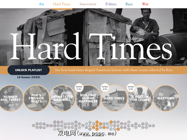纪录片制片人肯·伯恩斯(Ken Burns)本周发行,不是新的纪录片,而是iPad应用程序,也称为肯·伯恩斯。该应用程序是一段简短的流媒体视频的集合,涵盖了从1776年到2000年的美国历史。