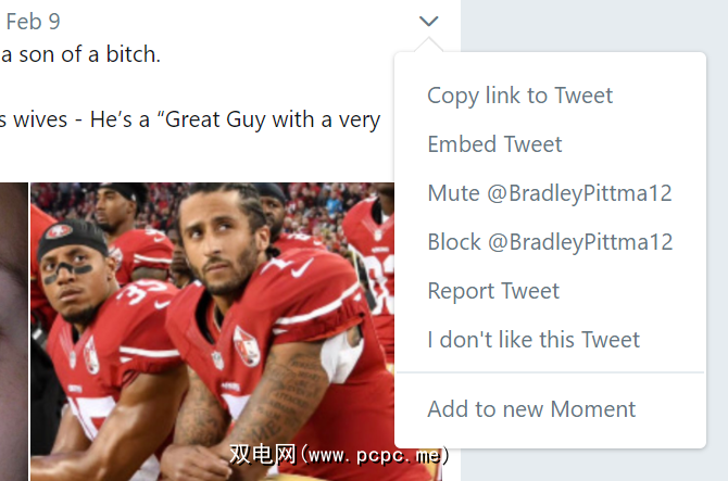 在Twitter上,减少Feed中的冒犯性帖子也很容易。当您看到不喜欢的人时,只需单击帖子右侧的下拉箭头,您就会看到您的选项。