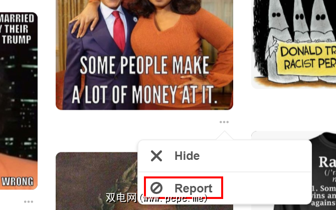 Pinterest也是如此。您所能做的就是单击“固定"下方的三个点,然后单击“ 报告"。