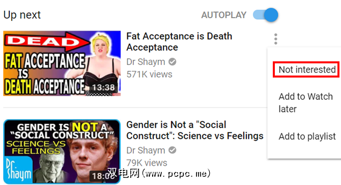 单击不感兴趣,然后根据YouTube的说明,将您的反馈意见纳入其算法中,以便为您提供视频推荐。随着时间的流逝,这应该通过从推荐列表中删除有损您的东西来改善您的YouTube体验。