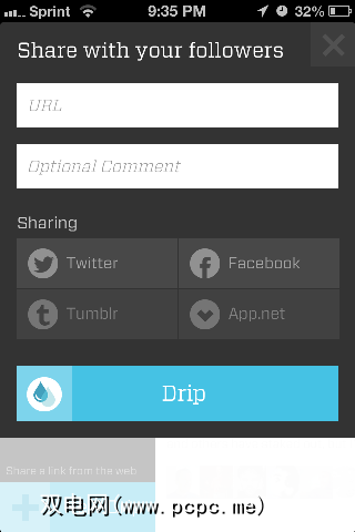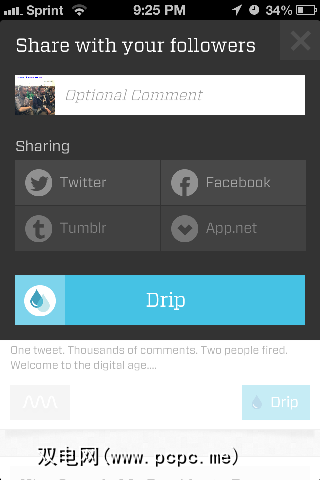 您可以通过点击“滴灌"按钮从主供稿中重新共享内容。您可以添加评论,还可以交叉链接到Twitter,Facebook,Tumblr或App.net。