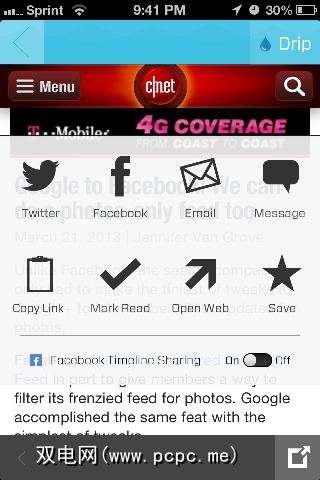 单击该链接将以精简的移动版本打开文章,您可以轻松地共享文章到Twitter和Facebook或通过电子邮件,以及保存,标记为已读等。