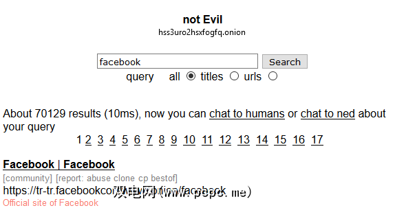 Torch是一个著名的Tor搜索引擎。但是,它不能用作常规搜索引擎。例如,使用TORCH搜索“ Facebook"不会返回Facebook洋葱网站。相反,它返回一长串对俄罗斯黑客论坛的引用。如果您使用Google搜索Facebook,那么您最终会进入社交媒体网站。