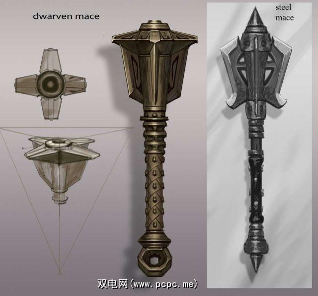 下面是传奇的贝塞斯达(Bethesda)概念艺术家亚当·阿当莫维兹(Adam Adamowicz)为流行游戏 Elder Scrolls V:Skyrim 制作的武器草图,该视频也出现在视频游戏图稿上。