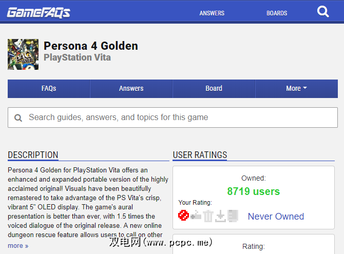 GameFAQs是视频游戏迷们的长期资源。除了用户提交的评论,作弊代码列表和留言板之外,该网站还提供几乎所有可以想象到的游戏的演练。