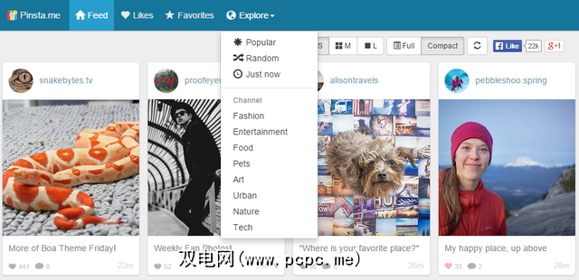 Pinsta.me提供直观的设计,可轻松调整5种不同方式:以完整或紧凑的视图显示小,中或大照片。您可以对它们进行喜欢和评论,并使用“浏览"功能根据“受欢迎",“随机",“立即"或特定类别的渠道(例如艺术,宠物,科技等)发现照片和用户。