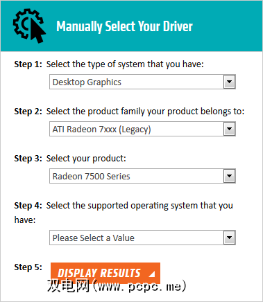 如果要进行手动选择,请确保您选择的是传统的ATI驱动程序,而不是最近的AMD驱动程序。您会发现XP是OS下拉菜单中命名的最现代的操作系统,但是这些驱动程序应该可以在Windows 7上运行。