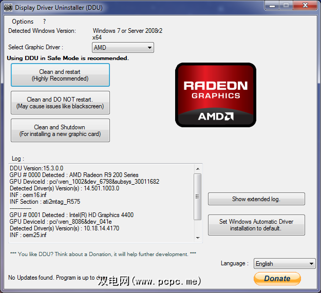 首先,请从网站上下载该软件的最新版本,解压缩下载文件,然后运行该应用程序。它将询问您是否要引导到安全模式,请确认您要这样做,系统将自动重新引导并再次加载Display Driver Uninstaller。它应该已经检测到您正在使用AMD / ATI驱动程序,但是如果没有,请从下拉列表中选择它。准备卸载时,单击清洁并重新启动按钮,让程序执行其操作。