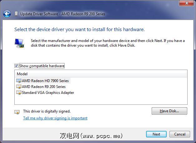 然后,您将看到驱动程序列表。在此阶段,您的选择将因您的特定ATI图形卡而异,但是理想情况下,您应该能够选择一个没有Microsoft Corporation命名的图形卡。如果没有可用的驱动程序,并且不清楚应该选择哪个驱动程序,则可能必须依次尝试所有驱动程序(确保在每次安装后都进行卸载)。选择驱动程序,单击下一步,然后让向导发挥作用。