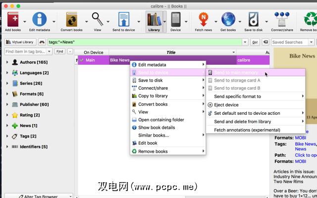 现在插入Kindle,右键单击新闻源,然后选择发送到设备>发送到主内存。那样,您的RSS提要就在Kindle上!