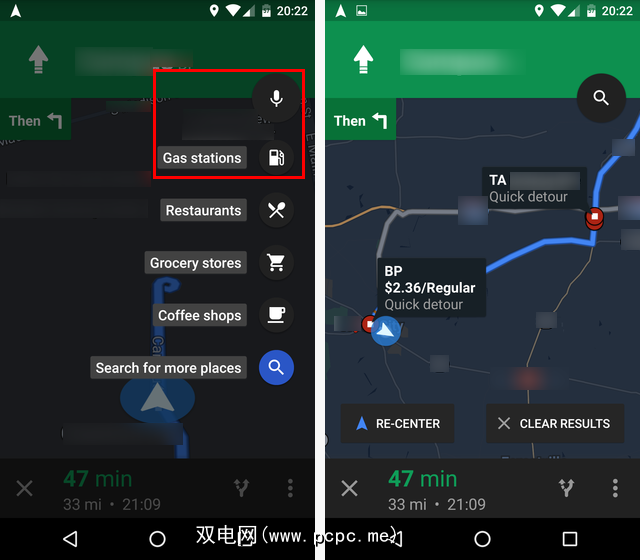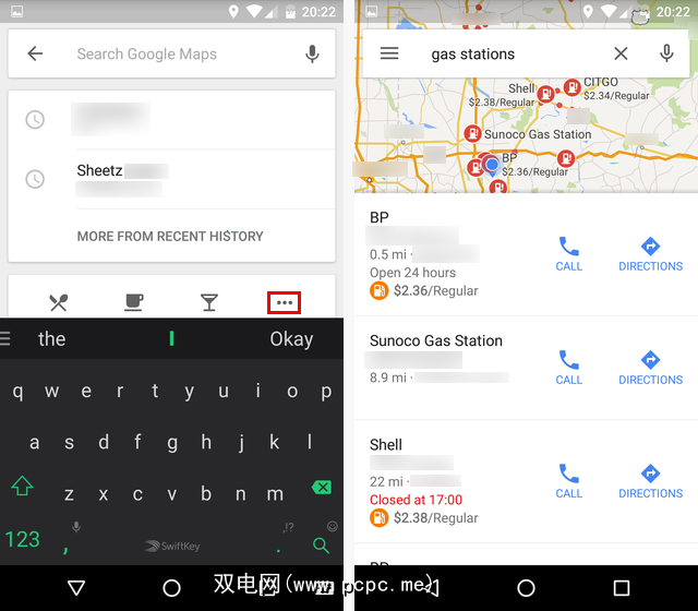 如果您不导航并且只想查看附近的汽油价格,请点击位于屏幕顶部。您可以在搜索栏中手动输入“加油站" ,或使用屏幕底部的三个点(食物和饮料图标旁边)拉出地图的所有预定义类别,然后选择加油站。