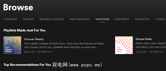 当所有其他选项均失败时,Spotify会提供一个名为发现的完整选项卡,用于帮助您查找新音乐。要访问它,请单击左侧栏上的浏览条目,然后在顶行中找到发现。