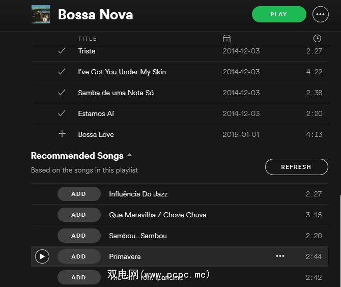 一旦播放列表中有一些曲目,请在播放列表中单击它。左侧边栏。向下滚动到底部,您会看到推荐的歌曲。如果您没有在其下方看到新的曲目,请单击其旁边的下拉箭头。您可以播放这些文件以进行预览,然后按添加将它们发送到您的播放列表中(如果您喜欢)。按下 Refresh (刷新)按钮以进行其他选择。