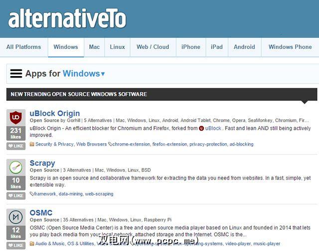 虽然它不仅专注于开源,但是AlternativeTo允许您筛选平台(例如Windows)和许可(例如开源),导致Windows可以使用大约4,600个开源程序。这些进一步分为Office,Games,Audio,Backup等类别。