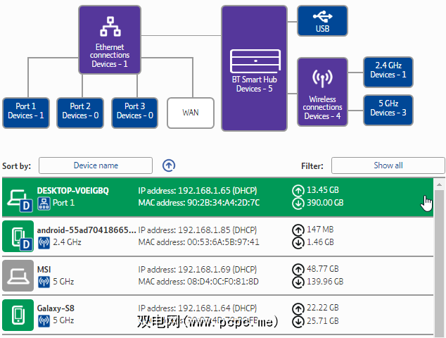 路由器设置中的页面包含当前连接到网络的每个设备。您可以检查设备的IP地址,MAC地址及其当前连接状态。根据您的路由器,您可能还可以访问网络信息,例如当前的下载和上传速度,以及每个设备正在使用或已使用的数据量。