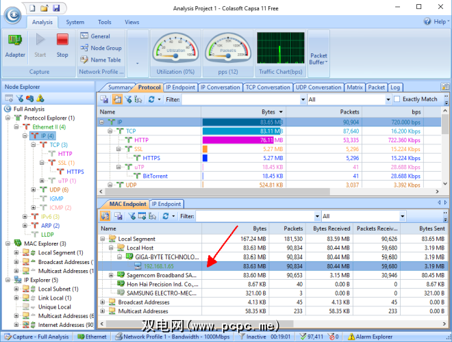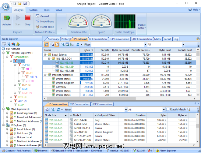 您也可以以不同的方式组织此信息。在分析面板中,点击 IP端点标签,然后浏览到您的设备IP地址。分析工具栏显示本地主机的所有传入和传出连接,其地理位置端点等。节点2列可以引起有趣的阅读!