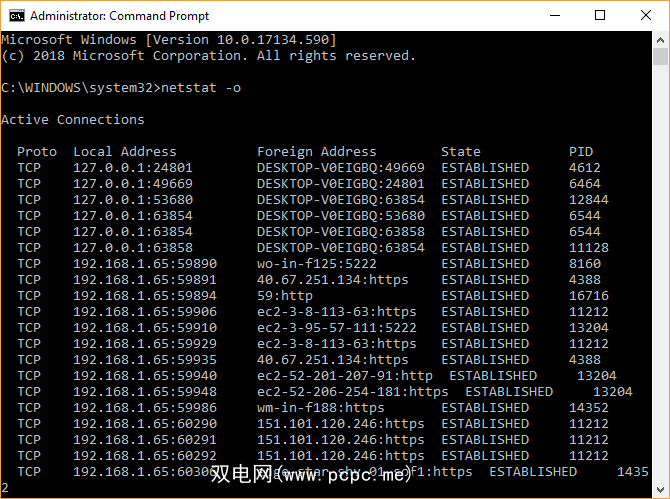 在“开始"菜单搜索栏中,键入命令,然后右键单击并选择以管理员身份运行。打开命令提示符后,输入 netstat -o 并按Enter。以下是计算机上每个活动网络连接,他们正在侦听的端口,外部地址以及该网络连接所属的进程的长长列表。