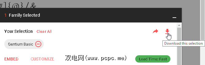 点击选择此字体选项。然后,单击窗口底部显示的菜单。完成选择一种或多种字体后,选择“下载"图标。