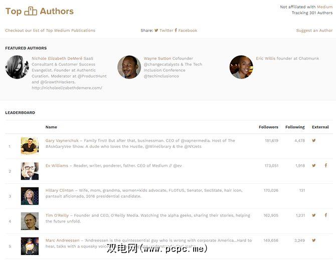 发现内容的另一种方法在Medium上要遵循数字。在这两个站点之间,Medium上的顶级作者和顶级出版物排行榜,跟踪了300多个作者和300多个出版物,并且作者和出版物按关注者数量排名。