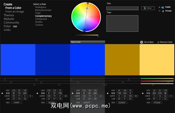 用颜色创建主题是很容易理解的事情,并且还提供了一些视觉上的学习色彩规则方面的经验。首先选择基础颜色,然后选择规则。您可以在色轮上拖动各个点,并观察每种色调之间的关系。要保存主题,请输入标题和一些标签,然后选择是公开共享还是不公开。然后,您可以进行进一步的更改而不会丢失原始文件。可以在 Mykuler 菜单项下检索已保存的主题。