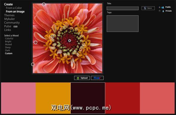 要创建主题,请按创建按钮并选择是从现有颜色还是从图像创建。图片上传基本上会将您的图片还原为5种最主要的颜色。它的用途是无限的,您可以选择直接从Flickr导入,也可以从PC上传。上传完图像后,将图像上的各个高亮点拖动以隔离不同的颜色。