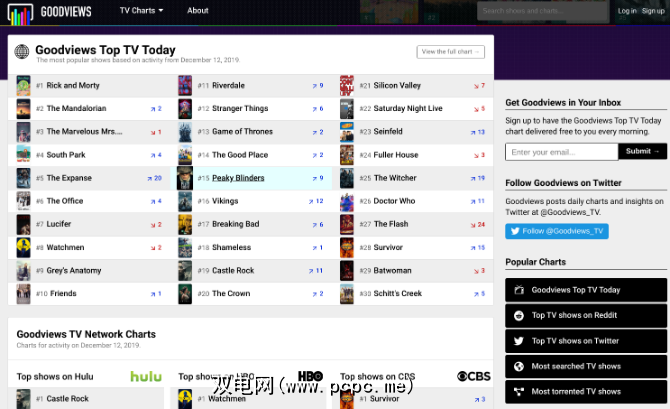 该应用程序跟踪Twitter和Reddit上正在谈论的电视节目,网络搜索以及大多数洪流节目。通过汇总来自所有这些不同来源的统计信息,Goodviews创造了类似于流媒体电视连续剧的广告牌图表。这里有一个整体列表以及子类别。