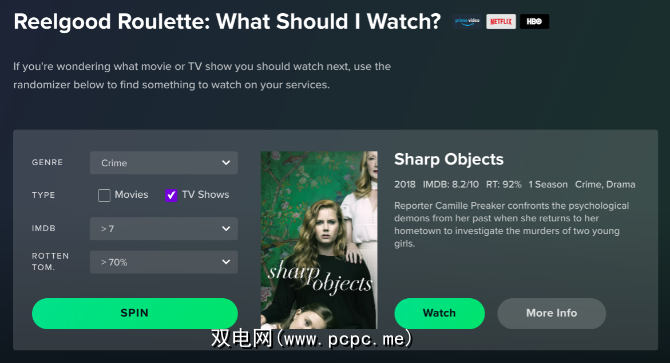 Reelgood一直是我们最喜欢的网站,以寻找下一个要观看的电视节目。但是它已经通过Reelgood Roulette提升了游戏水平。这会随机选择要收看的电视连续剧,同时仍然为您提供一些缩小选择范围的方法。