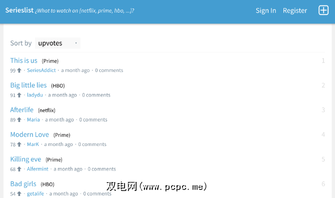 Serieslist.io试试看,这是寻找新节目观看的一种好方法。这只是电视节目名称的列表,以及可用的流媒体服务。您可以按赞,最新或评论对列表进行排序。简单容易