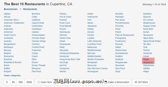 查找特定区域中的所有餐馆,然后扩展类别。素食主义者和素食主义者应在字母顺序列表中。