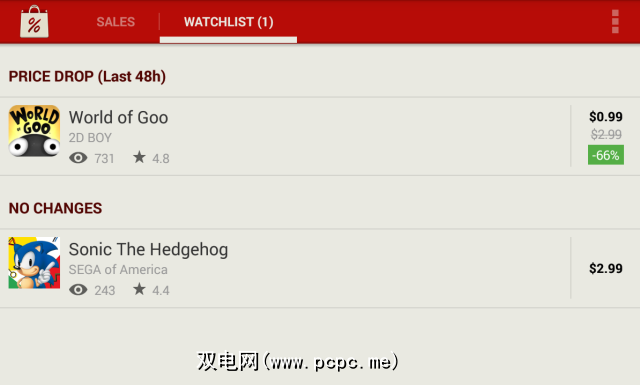 如果您仅对一些应用程序感兴趣,您可以将它们添加到您的AppSales愿望清单。 AppSales可让您监控愿望清单上的应用程序是否有降价,并允许它们在最终销售时购买。如果您有耐心,这可能是省钱的好方法。
