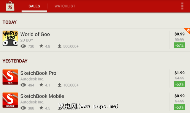 AppSales是在Android应用上查找交易的最佳应用-就像Google Play没有的“销售"类别。 AppSales显示当前正在销售的应用程序和游戏,使您可以快速前往Play商店并在需要时购买它们。默认情况下,它会显示通知,但您可以轻松地禁用这些通知。