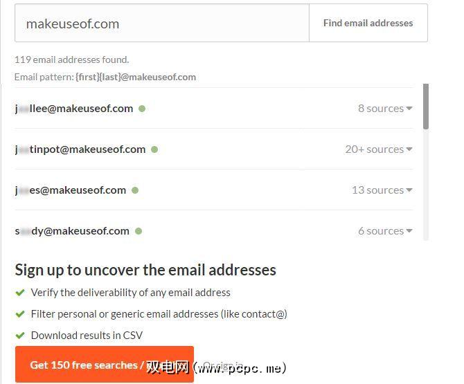 在面向企业的营销中,Hunter是一种可以帮助您的搜索。只需输入一个域名(例如@ PCPC.me),Hunter就会尽最大努力查找该公司的所有电子邮件地址。一个免费帐户允许您每月进行150次搜索,这对于个人使用来说应该足够了。