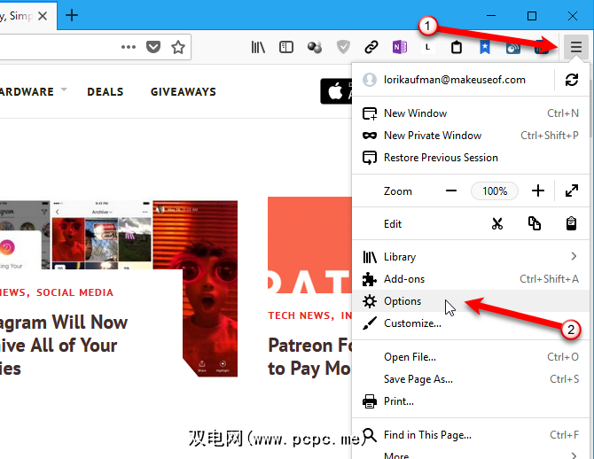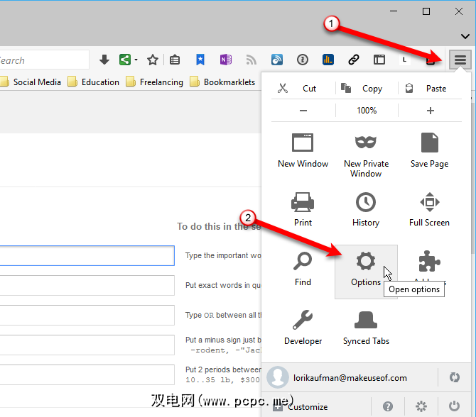 下一部分中讨论的检查Firefox版本的方法默认情况下会自动更新Firefox。为防止这种情况,请单击Firefox菜单,然后单击选项。